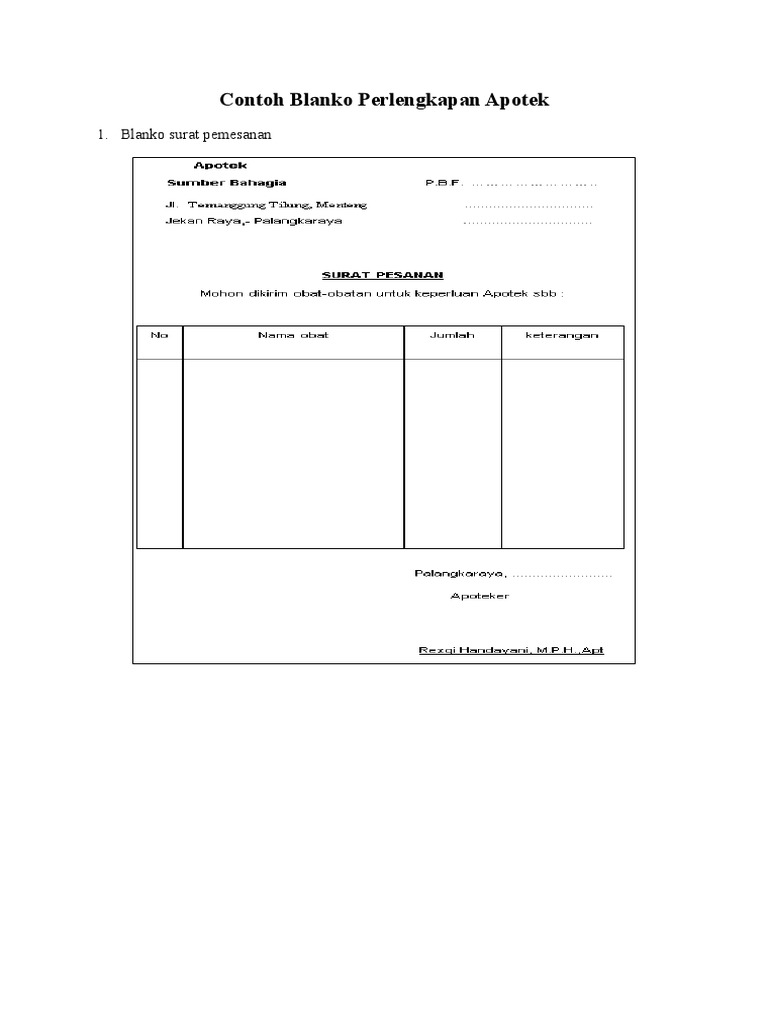 Buku standar Farmakope Indonesia ISO MIMS DPHO serta kumpulan UU tentang apotek. Blanko Pesanan Obat 2. Blanko surat pesanan b.